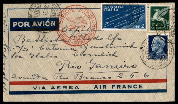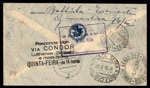 7° Volo in Sud America/7° Sudamerikafahrt 29 giugno/2 luglio 1935 (Longhi 922 - Michel 454) busta da Trieste del 26.6.35 con al retro raro timbro (L5) ""Responda Logo/Via Condor"