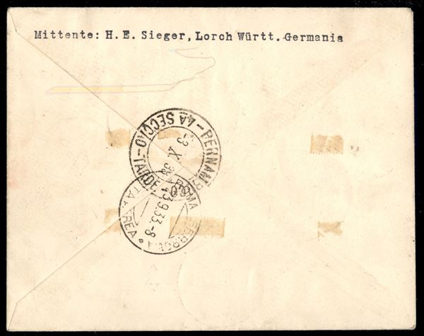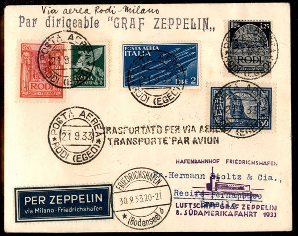 8° Volo in Sud America/8° Sudamerikafahrt - 30 settembre/3 ottobre 1933 (Longhi 804 - Michel 343a) busta da Rodi con affrancatura Egeo + Regno