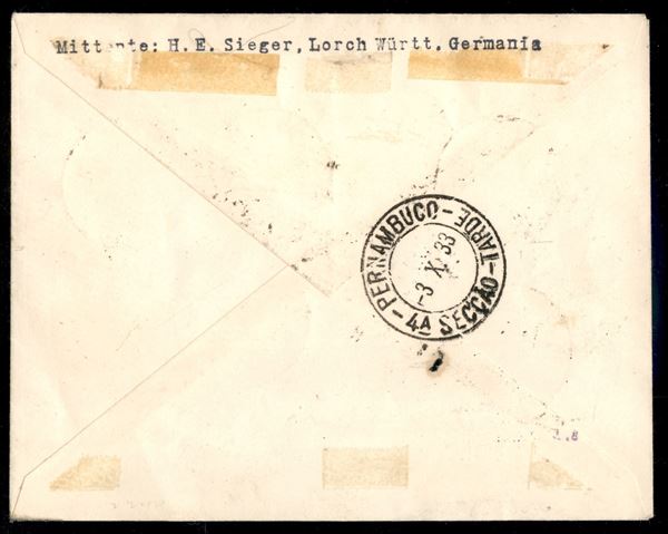 8° Volo in Sud America/8° Sudamerikafahrt - 30 settembre/3 ottobre 1933 (Longhi 811 - Michel 343a) busta da Tripoli d'Africa affrancata con valori di Libia e Tripolitania