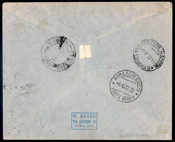 8° Volo in Sud America/8° Sudamerikafahrt - 9/13 ottobre 1932 (Longhi 159 - Michel 282a) busta da Tripoli d'Africa del 6.10.32 per Porto Alegre affrancato con valori delle Colonie Italiane compresa rara quartina del 80 cent Posta Aerea di Libia - bella combinazione