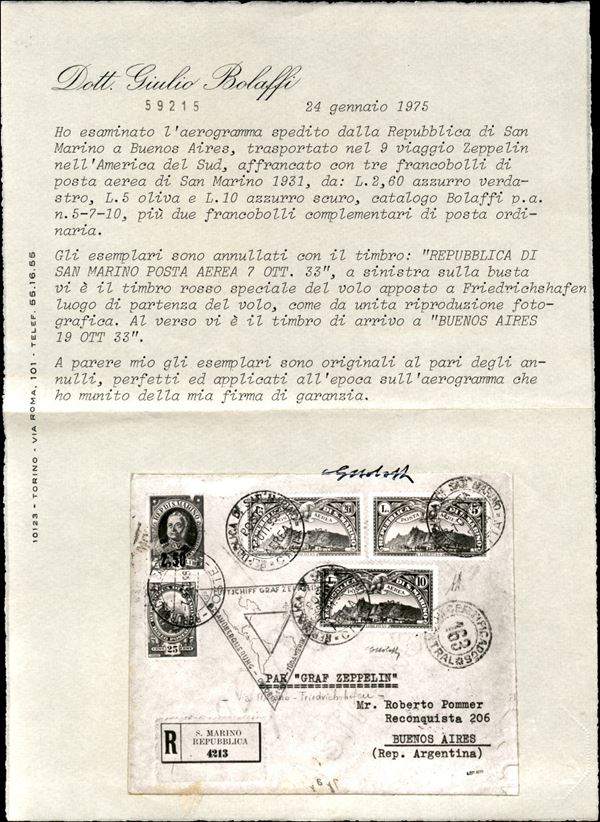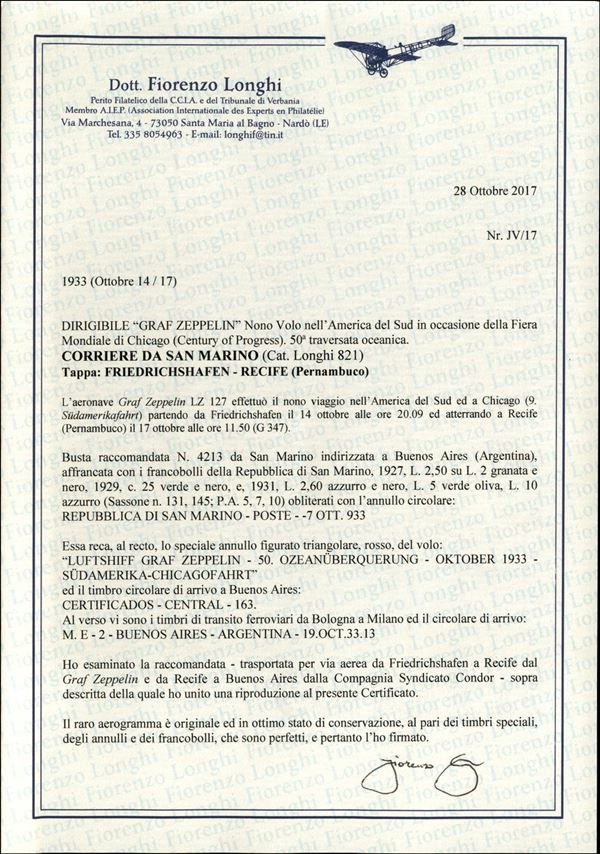 9° Volo in Sud America/50 Ozeanuberquerung Chicagofahrt 14ottobre/2 novembre 1933 - Friedrichshafen Recife (Longhi 821 - Michel 347a) busta da San Marino affrancata con ordinaria + aerea - raro - cert. Bolaffi + cert. Longhi