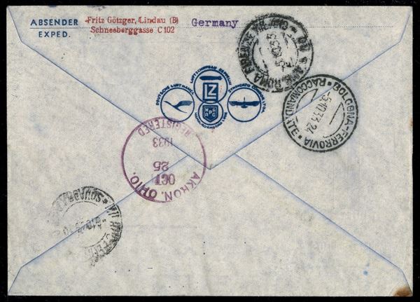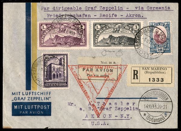 9° Volo in Sud America/50 Ozeanuberquerung Chicagofahrt 23/25 ottobre 1933 - Friedrichshafen Miami Akkron (Longhi 833 - Michel 351a) busta da San Marino - raro - Longhi