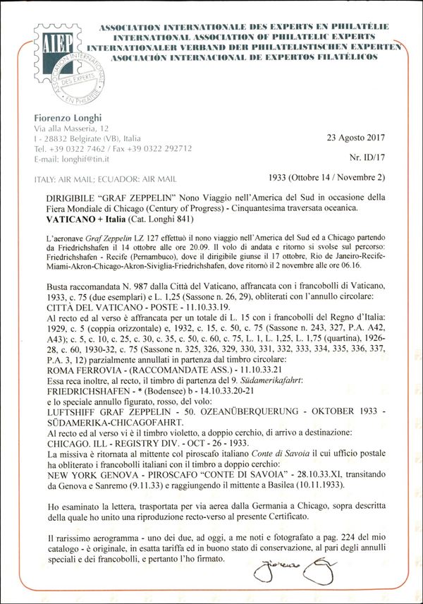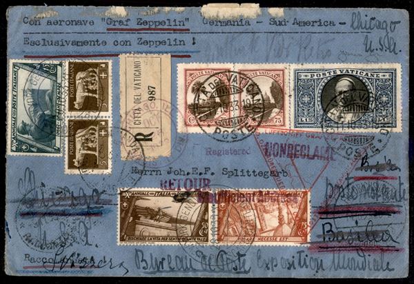 9° Volo in Sud America/50 Ozeanuberquerung Chicagofahrt 23/25 ottobre 1933 - Friedrichshafen Akron Chicago (Longhi 841 - Michel 352a) busta da Cittą del Vaticano con affrancatura mista Vaticano + Italia - 2 buste note - rarissomo - cert. Longhi