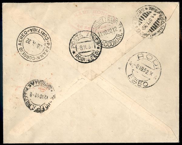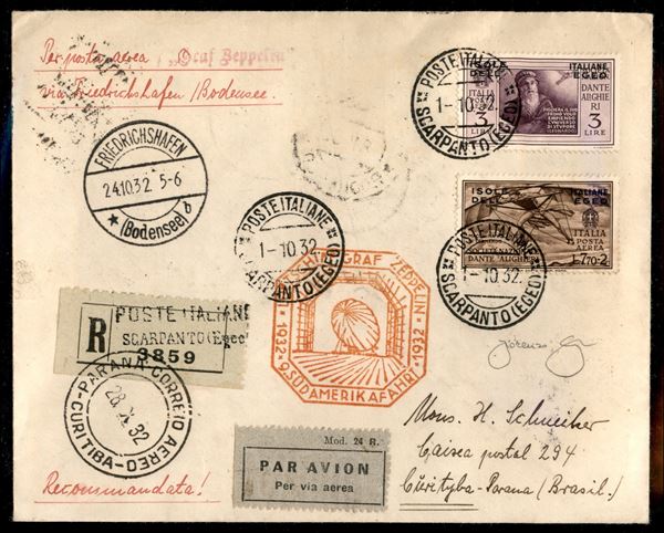 9° Volo in Sud America/9° Sudamerikafahrt - 24/27 ottobre 1932 (Longhi 163a - Michel 286a) busta da Scarpanto (Egeo) del 1.10.32 per Curitiba Parana (Brasile) - unica busta conosciuta proveniente dall'isola di Scarpanto - cert. Longhi