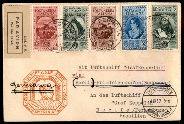 9° Volo in Sud America/9° Sudamerikafahrt - 24/27 ottobre 1932 (Longhi 166 - Michel 286a) busta da Roma del 2.10.32 per Recife con affrancatura di Regno