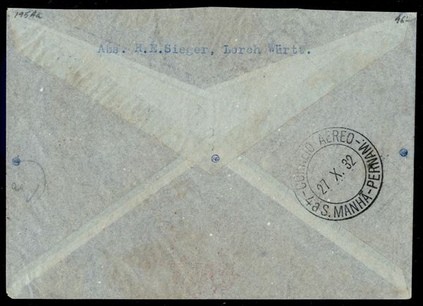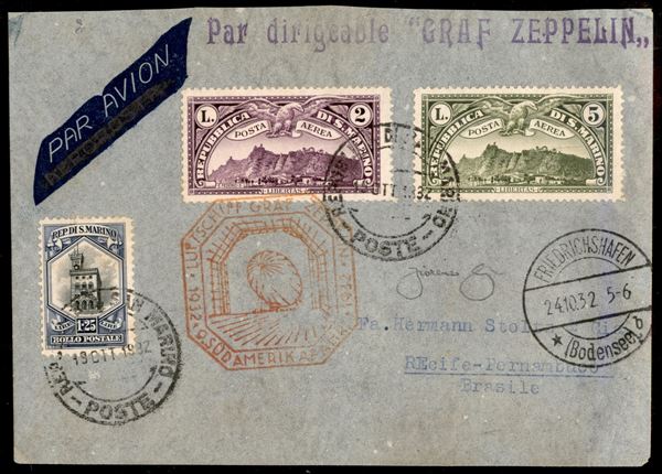 9° Volo in Sud America/9° Sudamerikafahrt - 24/27 ottobre 1932 (Longhi 167 - Michel 286a) busta da San Marino del 19.10.32 per Recife - Longhi