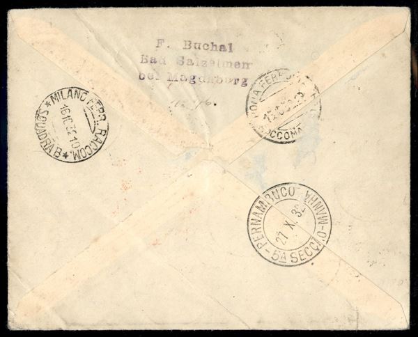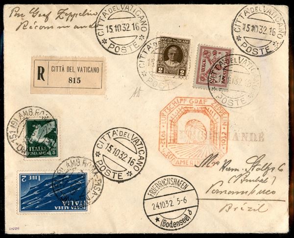 9° Volo in Sud America/9° Sudamerikafahrt - 24/27 ottobre 1932 (Longhi 170 - Michel 286a) busta da Cittą del Vaticano del 15.10.32 per Pernambuco con affrancatura mista Vaticano + Italia con i valori di quest'ultima annullati con ambulante ferroviario Roma Pisa Milano - raro (vedi nota catalogo Longhi) - Diena