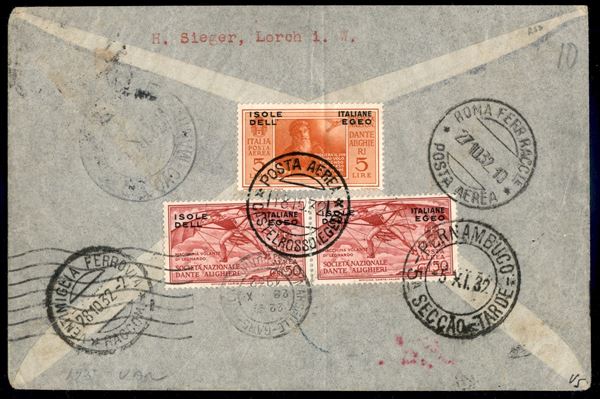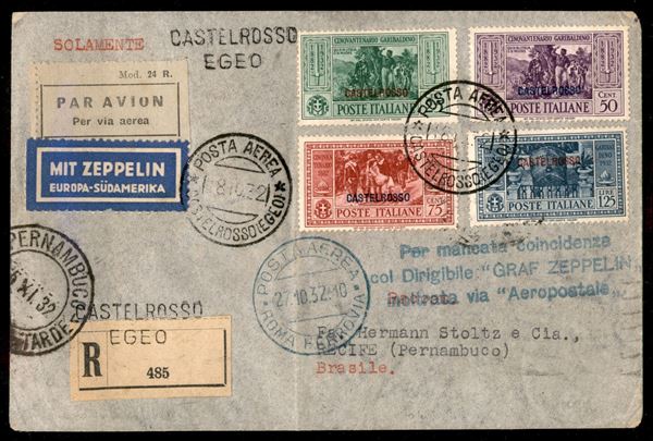 9° Volo in Sud America/9° Sudamerikafahrt - 24/27 ottobre 1932 - corriere da Castelrosso (Longhi 172 - Michel 286) busta per Recife del 18.10.32 - 10 lettere volate