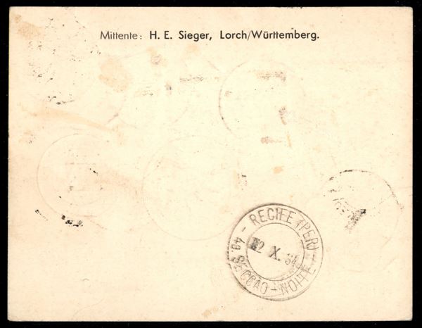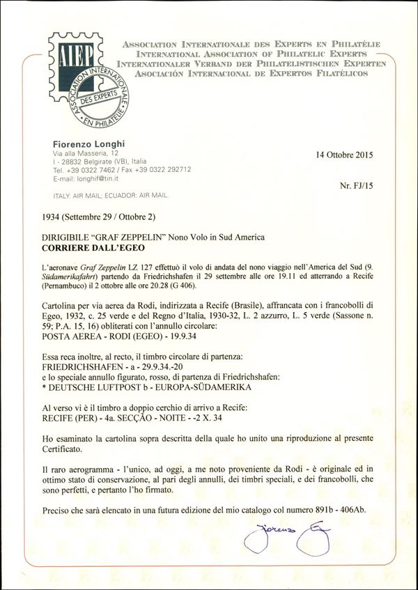 9° Volo in Sud America/9° Sudamerikafahrt 29 settembre/2 ottobre 1934 (Longhi 891b - Michel 406 var.) cartolina da Rodi (Egeo) con affrancatura mista Egeo + Regno - unica nota - rarissimo - cert. Longhi