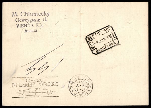 Cirenaica - Volo di ritorno Roma Friedrichshafen - 29/30 maggio 1933 (Longhi 320a - Michel 304Fa tipo) cartolina raccomandata da Bengasi del 23.5.33 affrancata con il 3 lire Zeppeli Cirenaica - 2 sole note da Bengasi anzichè Tripoli - molto raro - Diena