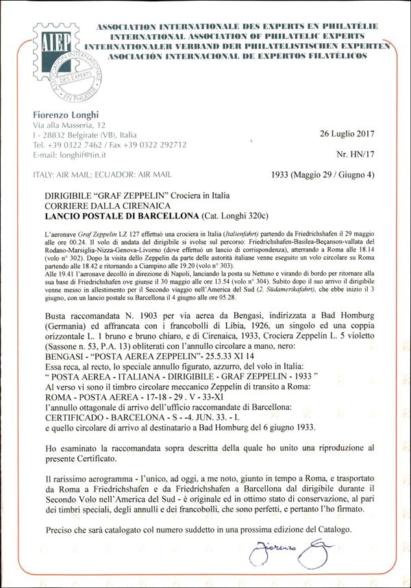 Cirenaica - Volo di ritorno Roma Friedrichshafen 29/30 maggio 1933 - lancio su Barcellona (Longhi 320c - Michel 304Fb tipo) busta da Bengasi del 25.3.33 affrancata con il 5 lire Zeppelin Cirenaica - unico noto giunto in tempo a Roma e trasportato - rarissimo - cert. Longhi