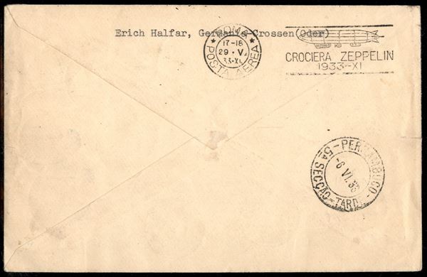 Cirenaica - Volo di ritorno Roma Friedrichshafen - 29/30 maggio 1933 (Longhi 327a/Michel 304Fa tipo) busta raccomandata da Bengasi del 13.5.33 affrancata con 3 lire + 5 lire + 10 lire Zeppelin Cirenaica - unico noto con tale affrancatura - rarissimo - Diena