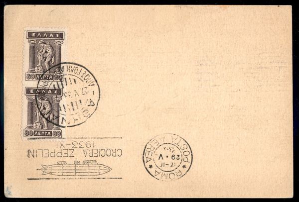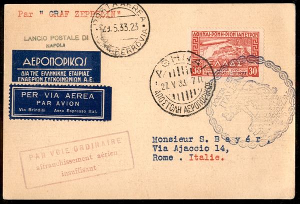 Grecia - 29 maggio 1933 - Posta per lancio su Nettuno con affrancatura insufficiente (Longhi 394 - Michel 304HI) cartolina da Atene del 27.5.33 per Roma - 2 lettere note - raro