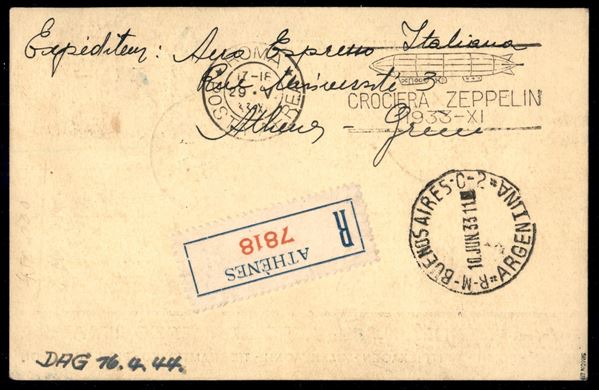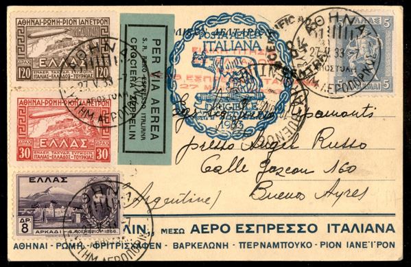 Grecia - Volo di ritorno Roma Friedrichshafen 29/30 maggio 1933 (Longhi 385 - Michel 304Hca) cartolina raccomandata da Atene del 27.5.33 con affrancatura Zeppelin in tariffa