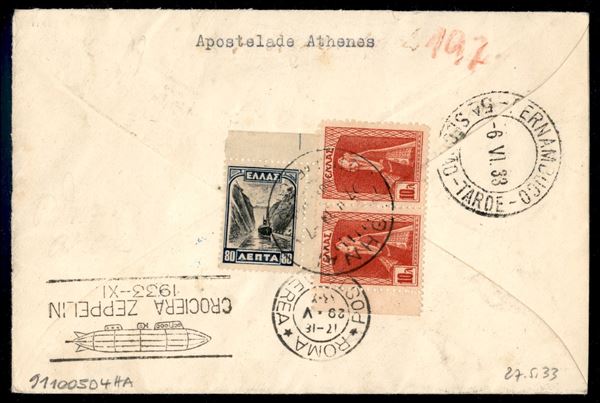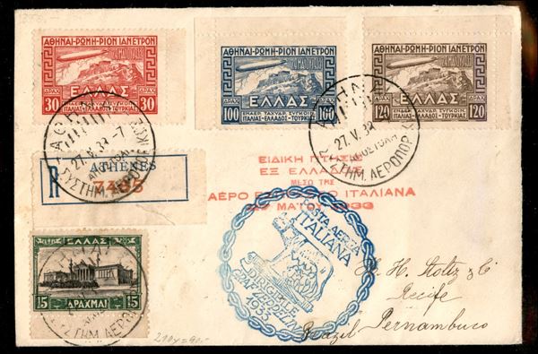 Grecia - Volo di ritorno Roma Friedrichshafen 29/30 maggio 1933 (Longhi 386 - Michel 304Hcb) busta raccomandata da Atene del 27.5.33 con affrancatura bordo e angolo di foglio
