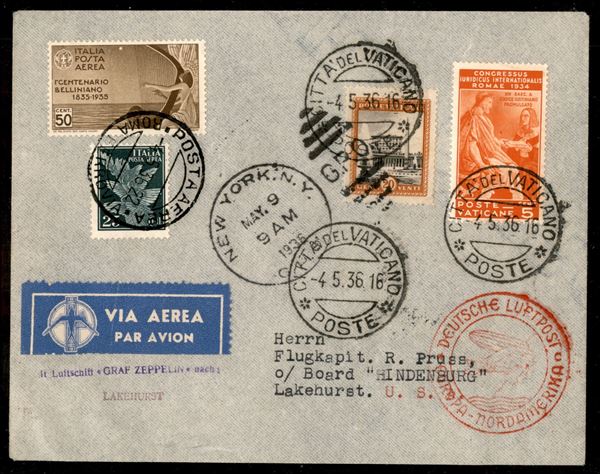 H12 - 1° Volo in Nord America/1° Nordamerikafahrt 6/9 maggio 1936 (Longhi 944 - Michel 12) busta da Cittą del Vaticano con affrancatura mista Vaticano + Italia - molto raro