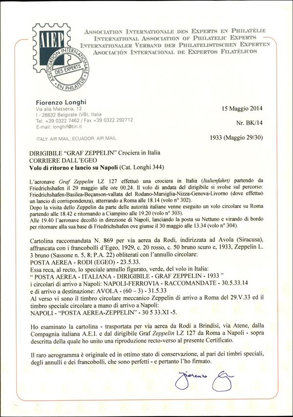 Isole dell'Egeo - Volo di ritorno Roma Friedrichshafen 29 maggio 1933 - lancio su Nettuno (Longhi 344 - Michel 304EIa) cartolina raccomandata da Rodi del 23.5.33 affrancata con il 3 lire Zeppeli Egeo - raro - cert. Longhi
