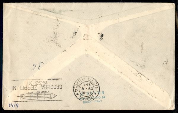 Isole dell'Egeo - Volo di ritorno Roma Friedrichshafen 29/30 maggio 1933 - lancio su Barcellona (Longhi 355 - Michel 304Ebb) busta raccomandata da Rodi del 24.5.33 affrancata con il 5 lire Zeppelin Egeo