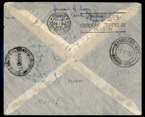Isole dell'Egeo - Volo di ritorno Roma Friedrichshafen 29/30 maggio 1933 (Longhi 360 - Michel 304Ecc) busta raccomandata da Rodi del 24.5.33 affrancata con il 20 lire Zeppelin Egeo - Colla