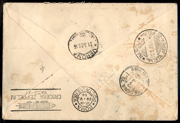 Italia - Volo di ritorno 29 maggio 1933 - lancio su Nettuno (Longhi 456 - Michel 304AI) aerogramma speciale da Roma affrancato con 3 lire Zeppelin + 5 lire Zeppelin - Gazzi