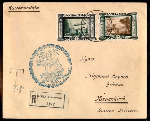 Italia - Volo di ritorno Roma Friedrichshafen 29 maggio 1933 (Longhi 474 - Michel 304A) aerogramma speciale da Roma del 29.5.33 affrancato con 3 lire Zeppelin + 5 lire Zeppelin - al retro cachet verde (F4) - tassato in arrivo