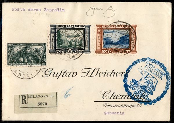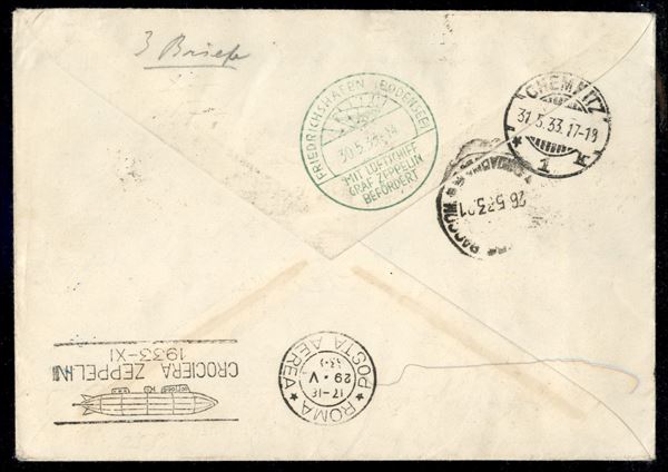 Italia - Volo di ritorno Roma Friedrichshafen 29 maggio 1933 (Longhi 481a - Michel 304A) busta da Roma del 29.5.33 affrancata con 3 lire + 20 lire Zeppelin - al retro cachet verde (F4) - unica nota con questa affrancatura - Longhi