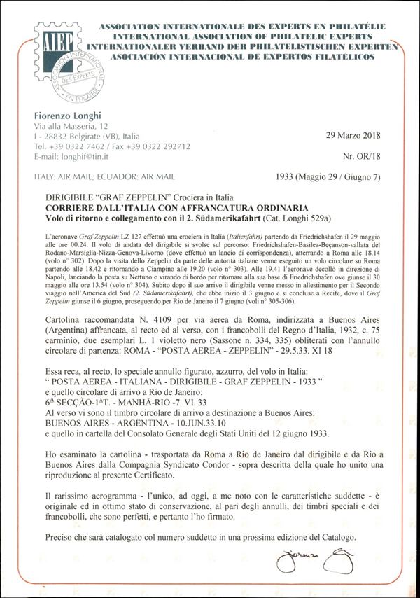 Italia - Volo di ritorno Roma Friedrichshafen 29/30 maggio 1933 - Collegamento con 2° Sudamerikafahrt (Longhi 529a - Michel 304Ac var.) cartolina da Roma del 29.5.33 per Buenos Aires con affrancatura ordinaria - unica nota - rarissimo - cert. Longhi