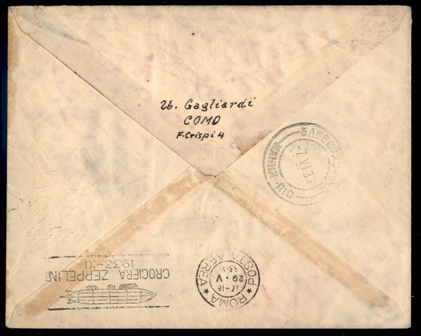 Italia - Volo di ritorno Roma Friedrichshafen 29/30 maggio 1933 - Collegamento con 2° Sudamerikafahrt (Longhi 530a - Michel 304Ace var.) busta da Como del 27.5.33 per Buenos Aires affrancata con 3 lire + 5 lire Zeppelin + complementari - Diena + Longhi + cert. Raybaudi