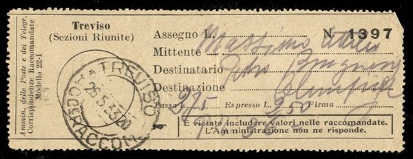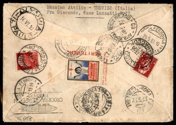 Italia - Volo di ritorno Roma Friedrichshafen 29/30 maggio 1933 - Collegamento con 2° Sudamerikafahrt (Longhi 547a - Michel 304Acb var.) busta da Treviso del 26.5.33 per Olimpia (Brasile) affrancata con striscia di tre del 12 lire Zeppelin + 2,50 lire Espresso + complementari - rarissima e bella busta completa del tagliando raccomandata di partenza e erinnofilo anti tubercolari come chiudi lettera