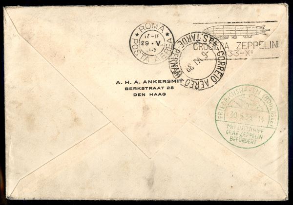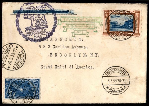 Italia - Volo di ritorno Roma Friedrichshafen 29/30 maggio 1933 - Collegamento con 2° Sudamerikafahrt (Longhi 562 - Michel 304A var.) busta da Rapallo del 26.5.33 per Brooklin (New York) affrancata con il 20 lire Zeppelin - cachet speciale verde 2° Volo in Sud America - raro