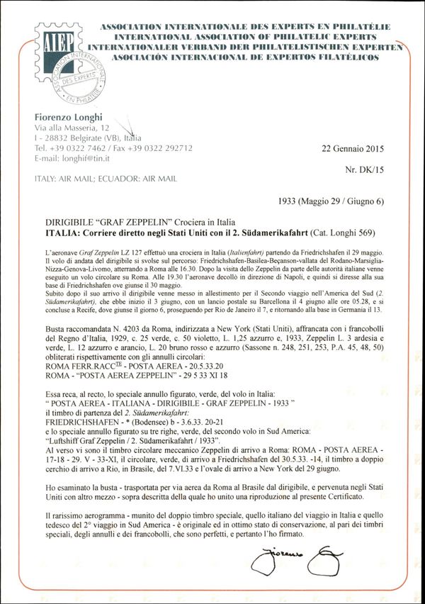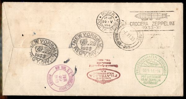 Italia - Volo di ritorno Roma Friedrichshafen 29/30 maggio 1933 - Collegamento con 2° Sudamerikafahrt (Longhi 569 - Michel 304A var.) busta da Roma del 20.5.33 per New York affrancata con 3 lire + 12 lire + 20 lire Zeppelin e con doppio timbro speciale Italiano/Tedesco - molto raro - cert. Longhi