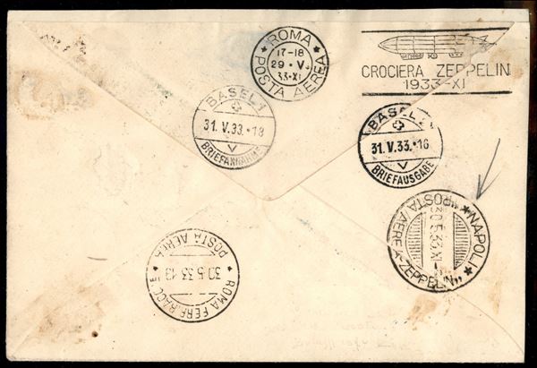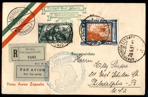 Italia - Volo di ritorno Roma Friedrichshafen 29/30 maggio 1933 - Collegamento con 2° Sudamerikafahrt (Longhi 571c - Michel 304A var.) busta da Roma del 29.5.33 per Filadelfia affrancata con il 12 lire Zeppelin - unico noto con questa affrancatura per gli USA - rarissimo