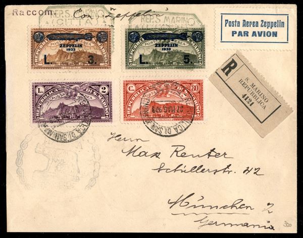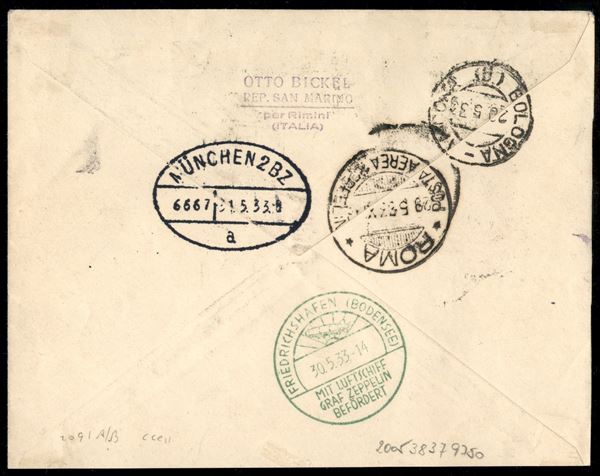 San Marino - Volo di ritorno Roma Friedrichshafen 29/30 maggio 1933 (Longhi 615 - Michel 304Da var.) busta affrancata con 3 lire + 5 lire Zeppelin