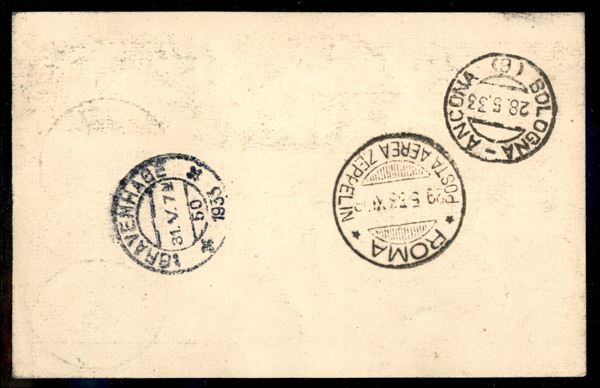 San Marino - Volo di ritorno Roma Friedrichshafen 29/30 maggio 1933 (Longhi 622a - Michel 304Da var.) cartolina affrancata con il 12 lire Zeppelin - unico noto - Longhi