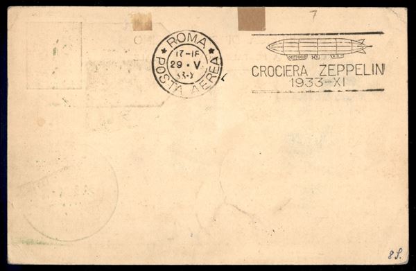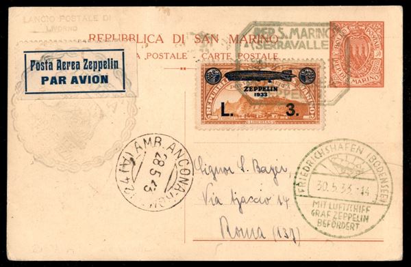San Marino - Volo di ritorno Roma Friedrichshafen 29/30 maggio 1933 - timbro ottagonale verde di Borgo (Longhi 633 - Michel 304Dae) cartolina da 30 cent affrancata con il 3 lire Zeppelin - molto raro