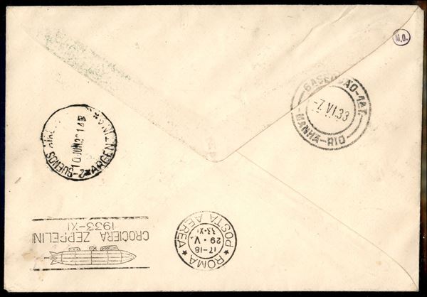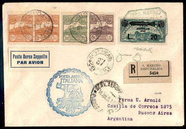 San Marino - Volo di ritorno Roma Friedrichshafen 29/30 maggio 1933 - collegamento con il 2° Sudamerikafahrt (Longhi 647 - Michel 304Dcd) busta affrancata con il 20 lire Zeppelin - Bolaffi + Longhi