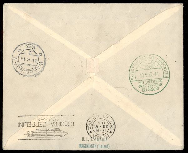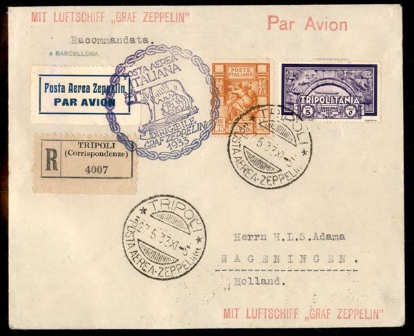 Tripolitania - Volo di ritorno Roma Friedrichshafen 29 maggio 1933 (Longhi 686 - Michel 304Gbb var.) busta affrancata con il 5 lire Zeppelin impostata per il lancio su Barcellona ma erroneamente scaricata a Friederichshafen
