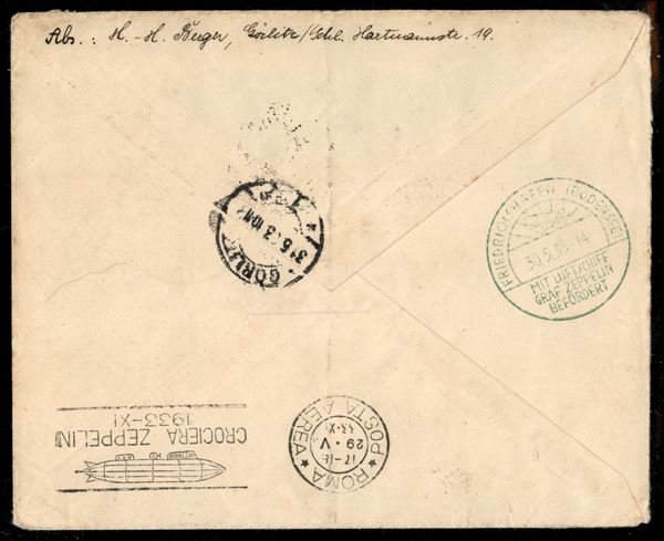 Tripolitania - Volo di ritorno Roma Friedrichshafen 29 maggio 1933 (Longhi 687a - Michel 304G var.) cartolina affrancata con 5 lire + 10 lire + 15 lire Zeppelin - 1 nota - rarissimo