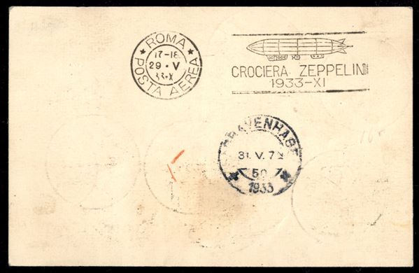 Tripolitania - Volo di ritorno Roma Friedrichshafen 29 maggio 1933 (Longhi 690a - Michel 304G var.) cartolina affrancata con 15 lire Zeppelin - 1 nota - rarissimo