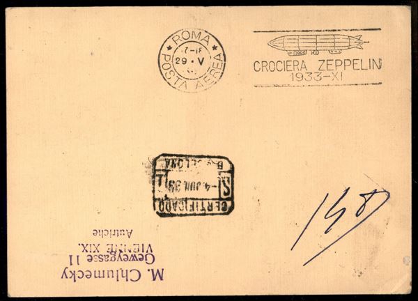 Tripolitania - Volo di ritorno Roma Friedrichshafen 29/30 maggio 1933 - lancio su Barcellona (Longhi 695 - Michel 304Gba) cartolina affrancata con il 3 lire Zeppelin - molto rara - Longhi