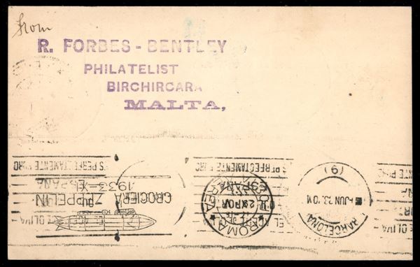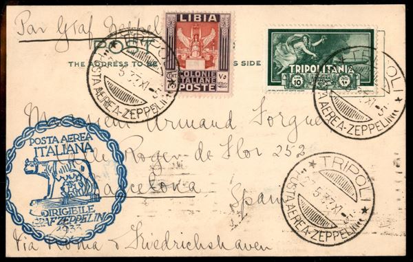 Tripolitania - Volo di ritorno Roma Friedrichshafen 29/30 maggio 1933 - lancio su Barcellona (Longhi 696a - Michel 304Gb var..) cartolina affrancata con il 10 lire Zeppelin - al retro raro timbro BA3 Barcellona - un solo pezzo noto con questa combinazione - molto raro