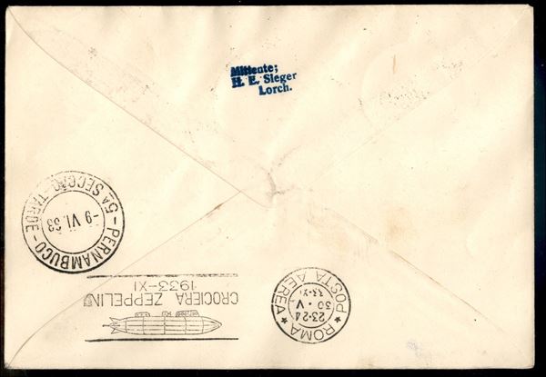Tripolitania - Volo di ritorno Roma Friedrichshafen 29/30 maggio 1933 (Longhi 698 - Michel 304Gcb) busta affrancata con il 12 lire per Pernambuco - Diena + Bolaffi