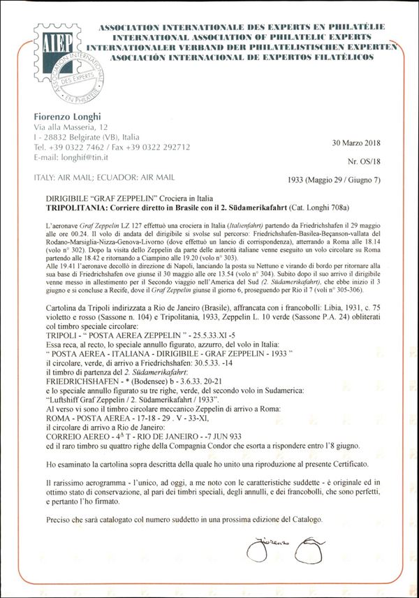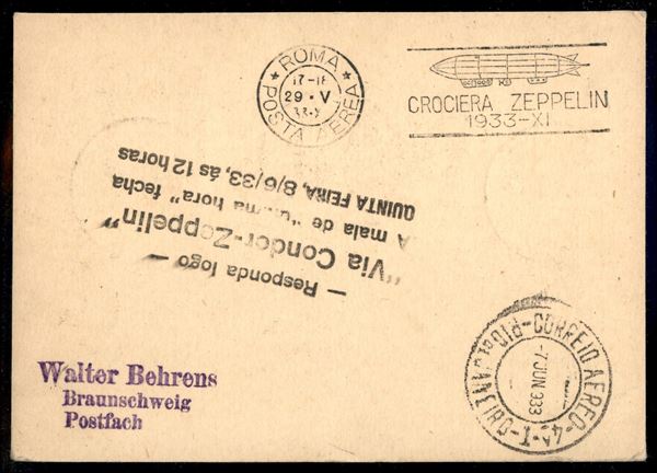 Tripolitania - Volo di ritorno Roma Friedrichshafen 29/30 maggio 1933 (Longhi 708a - Michel 304Gca var.) cartolina affrancata con il 10 lire Zeppelin per Rio de Janeiro con al retro raro timbro della Compagnia Condor - unico noto - cert. Longhi