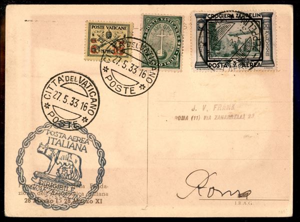 Vaticano - Volo circolare su Roma/Rom Rundfahrt 29 maggio 1933 - affrancatura mista Vaticano + Italia (Longhi 709 - Michel 303Ca) cartolina affrancata con il 3 lire Zeppelin