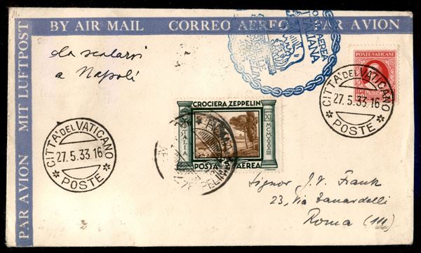 Vaticano - Volo circolare su Roma/Rom Rundfahrt 29 maggio 1933 - affrancatura mista Vaticano + Italia (Longhi 710 - Michel 303Cb) busta affrancata con il 5 lire Zeppelin