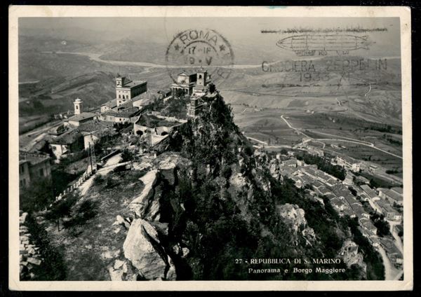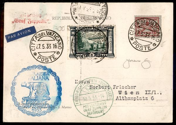 Vaticano - Volo di ritorno Roma Friedrichshafen 29/30 maggio 1933 - affrancatura mista Vaticano + Italia (Longhi 718 - Michel 304Caa) cartolina affrancata con il 3 lire Zeppelin e timbro speciale a mano di Roma - riprodotto a pag. 194 del catalogo Longhi - Longhi
