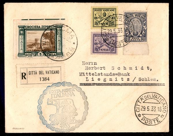 Vaticano - Volo di ritorno Roma Friedrichshafen 29/30 maggio 1933 - affrancatura mista Vaticano + Italia (Longhi 719 - Michel 304Cab) busta affrancata con il 5 lire Zeppelin e timbro speciale a mano di Roma