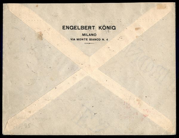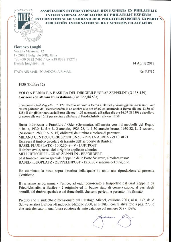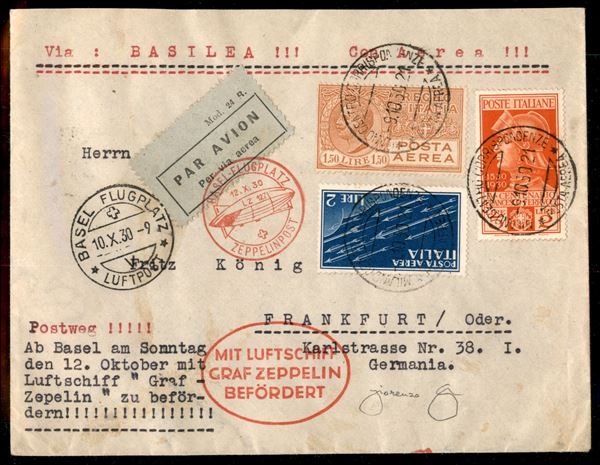 Volo a Berna e Basilea/Basel Flugplatz - 12 ottobre 1930 (longhi 53a - Michel 140 IA) busta da Milano del 9.10.30 per Francoforte con affrancatura italiana - unica lettera conosciuta del volo - ex asta Tresor - rarissimo - cert. Longhi