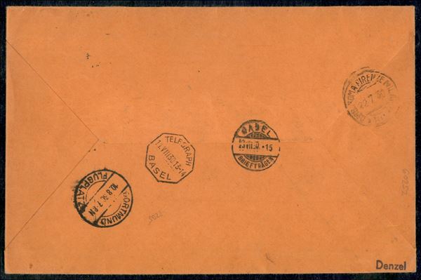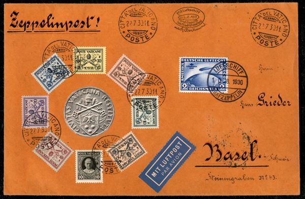 Volo a Darmstadt - 4/5 agosto 1930 - Friedrichhshafen Darmstadt (Longhi 43 - Michel 97) busta da Cittą del Vaticano del 22.7.30 per Basilea con affrancatura combinata Vaticano Germania per doppia spedizione