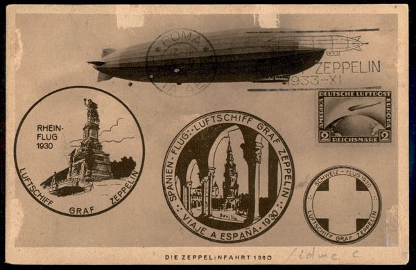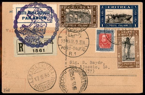 Volo circolare su Roma/Rundfahrt Rom - 29 maggio 1933 - posta da paesi esteri (Longhi 236 - Michel 303A) cartolina raccomandata dall'Eritrea - 6 cartoline volate - molto raro